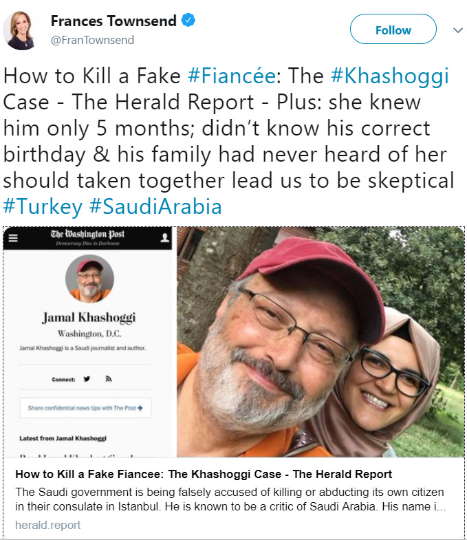 On Twitter, Townsend has struck a different tone. In addition to sharing mainstream media stories on Khashoggi's death, she has shared wild pro-Saudi conspiracy theories. She shared an article from the "Herald Report" claiming "[t]he Saudi government is being falsely accused of killing or abducting its own citizen in their consulate in Istanbul."
