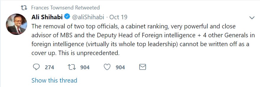 While the arrest of 18 people for Khashoggi's death was widely derided as a coverup designed to protect MBS, Townsend had a different approach. She retweeted Ali Shihabi, the head of The Arabia Foundation, an organization funded by Saudi businessmen with close ties to the government, who said the arrests were "unprecedented" and "cannot be dismissed as a coverup."