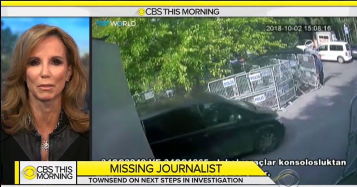 Townsend has only made one appearance on CBS News about Khashoggi's death, and her commentary was more circumspect. She emphasized "problems" with the Saudi account that Khashoggi was killed in an interrogation gone wrong. She said the "Saudis and Americans were looking for a way to get past this."