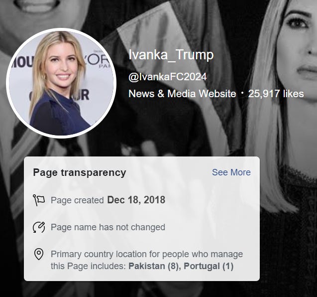 566,047 views came from a doctored video published to an unofficial Ivanka Trump page. The administrators of that page are located in Pakistan and Portugal.