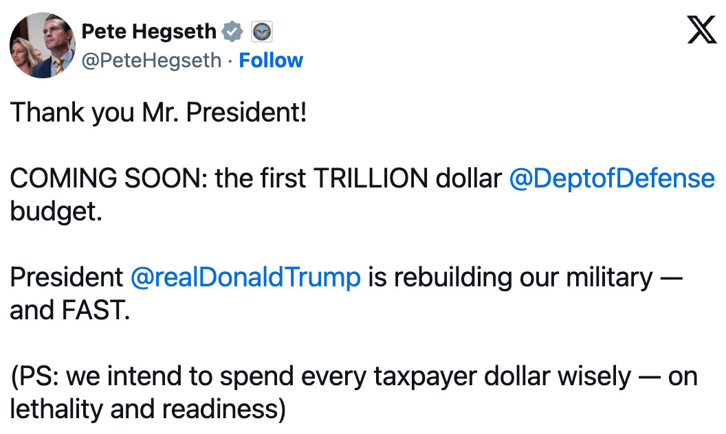 Hegseth, however, is a vocal supporter of Musk's efforts to cut government spending. On February 19, the DoD announced that it was going through a process to identify "8% of the Biden Administration's FY26 budget, totaling around $50 billion" to cut. These funds would then be used "on programs aligned with President Trump's priorities." Presumably, this was a way in which they could free up dollars for new spending without increasing the total budget. The DoD claimed this was possible through eliminating anything related to "'climate change' and other woke programs, as well as excessive bureaucracy."