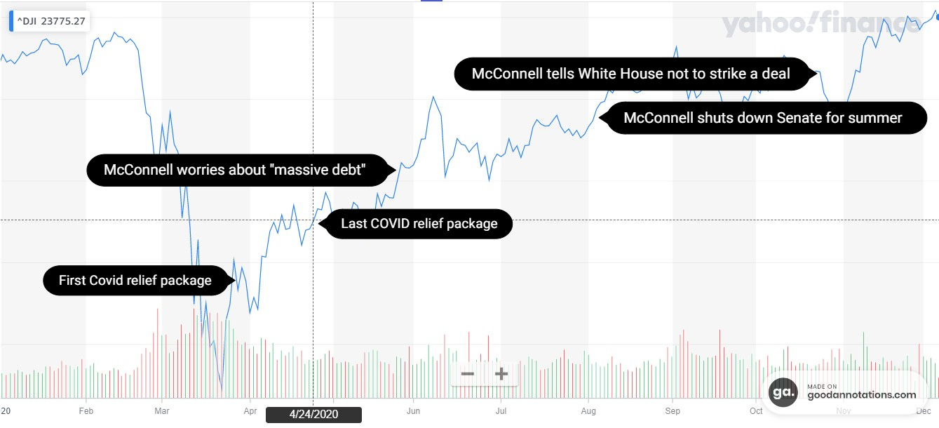 This month, McConnell has finally gotten serious about another round of pandemic relief. Why? It could be that a dramatic spike in case counts, hospitalizations, and deaths have given another round of relief new urgency. Or it could be that Senators Kelly Loeffler (R-GA) and David Perdue (R-GA), who face a run-off election on January 5, are campaigning on their support for additional pandemic relief. If Perdue and Loeffler both lose, McConnell will no longer control the Senate.