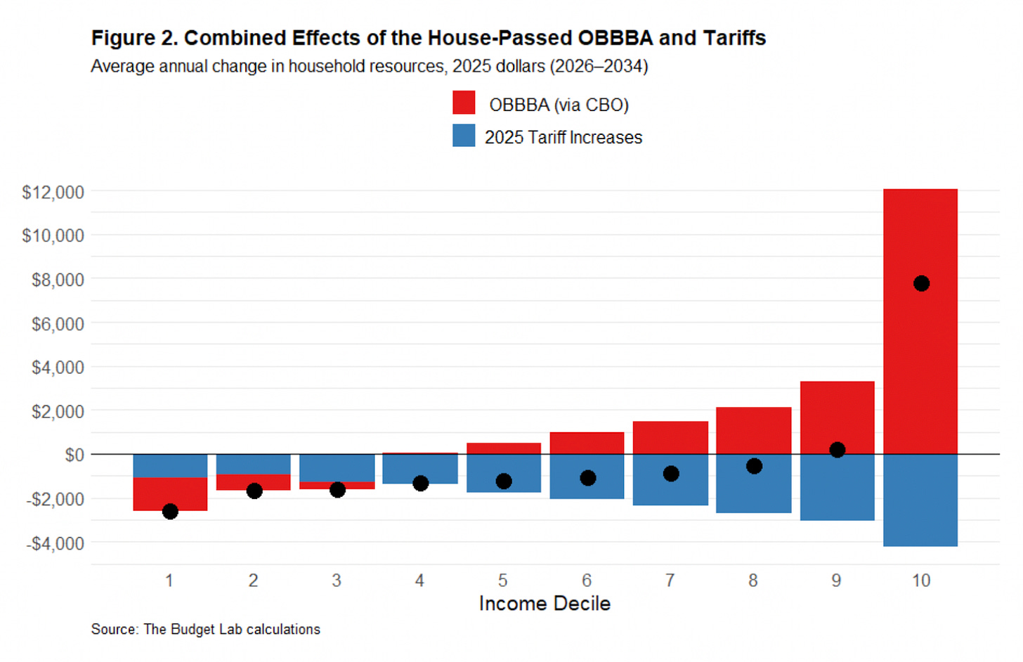 If one considers Trump's tariff policy, which is a tax on American consumers, the situation gets even worse. An analysis of the House version of Trump's megabill by the Budget Lab at Yale found that, combined with the impact of tariffs, only those in the top 10% will be better off.