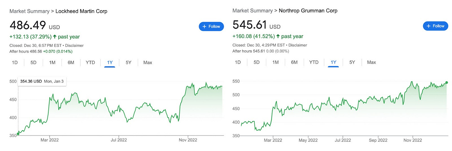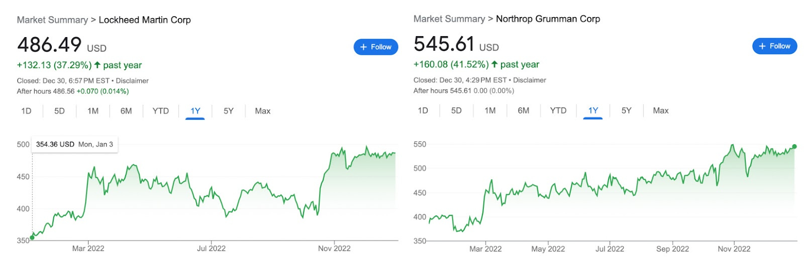 Investors have taken note of unrestrained spending on weapons and other military equipment. The S&P 500 index declined 19.4% in 2022; but Lockheed Martin and Northrop Grumman each saw their stock price increase in 2022 by more than 35%.