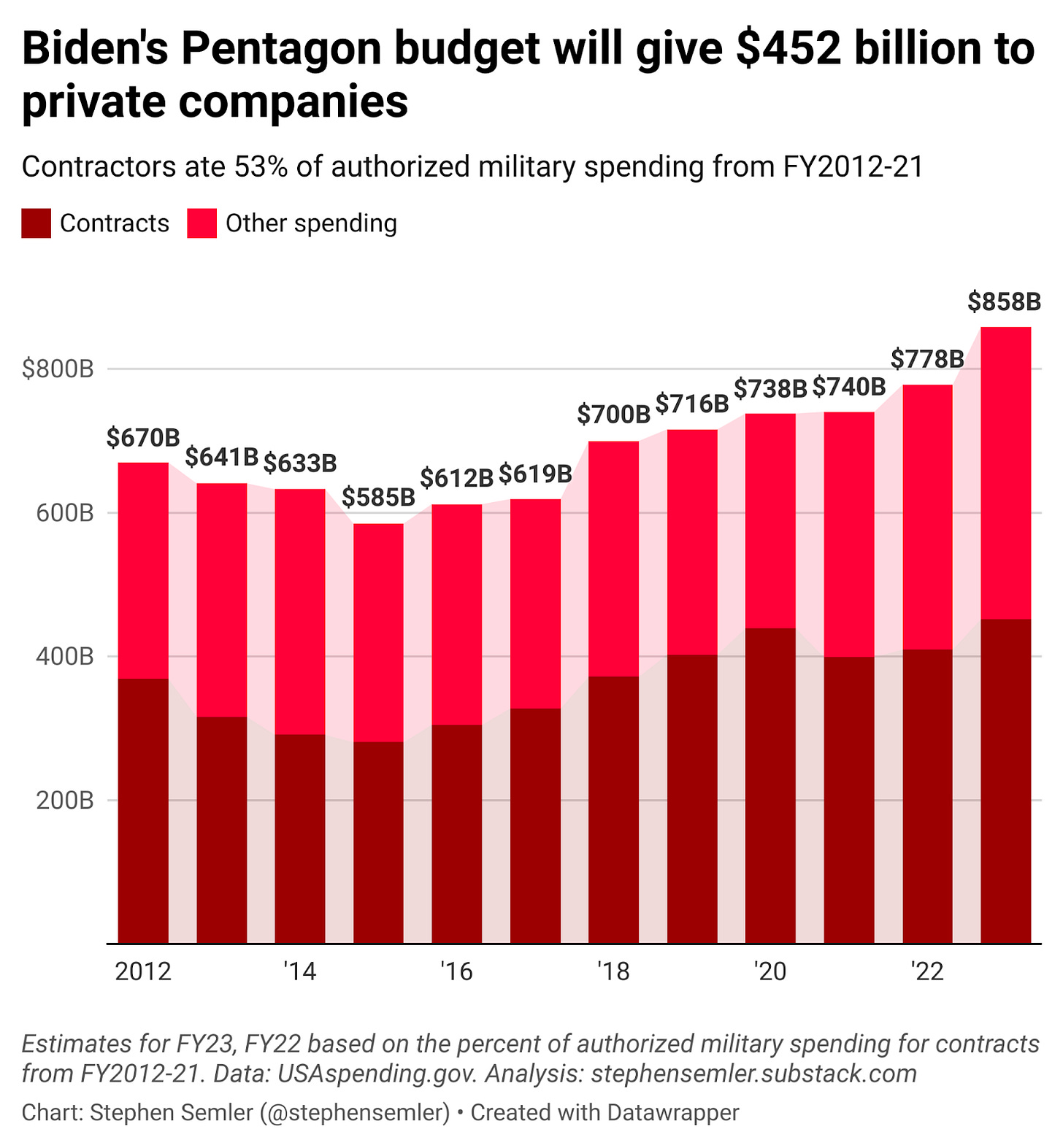 According to an analysis by Stephen Semler, approximately $452 billion of the $858 billion military budget will go to private contractors. Every year, more than half of military spending goes to contractors like Lockheed Martin, Northrop Grumman, and Raytheon.