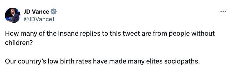 In a little-noticed March 21, 2021 tweet, Vance said that the decision not to have children has made many Americans "insane" and turned them into "sociopaths."