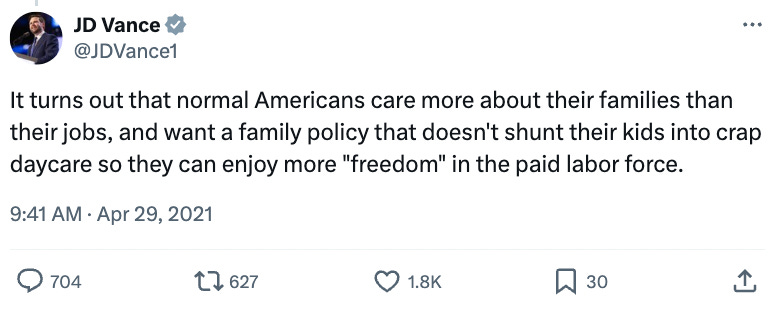 JD Vance’s wife works though—she’s an accomplished attorney. So his kids must be in daycare! What a hypocrite.