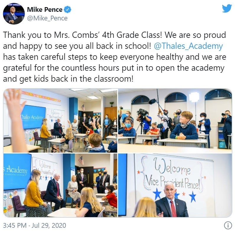On July 29, DeVos and Vice President Mike Pence visited Thales Academy, "a network of private nonsectarian community schools in North Carolina." DeVos said Thales Academy is a model for the nation. "Thales is a great example more schools could emulate. You didn't wait for guidance from the Department of Education. You didn't ask for permission," she said. "We're here today because to open up America, we've got to open up America's schools and Thales Academy is literally in the forefront," Pence added.