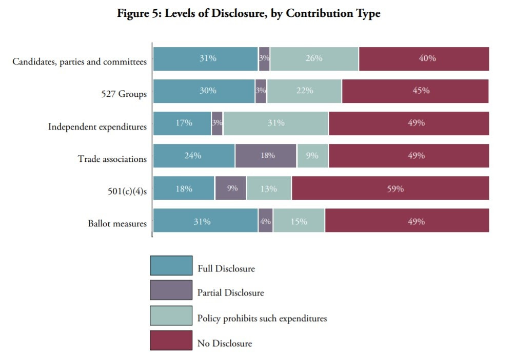 In response to pressure from advocates, some corporations have begun to voluntarily disclose more political spending. Still, among companies listed in S&P 500, only 18% fully disclose their contributions to 501(c)(4) advocacy groups, only 24% fully disclose their contributions to trade associations, and only 30% fully disclose their donations to 527 political organizations. Data from the Center for Political Accountability: