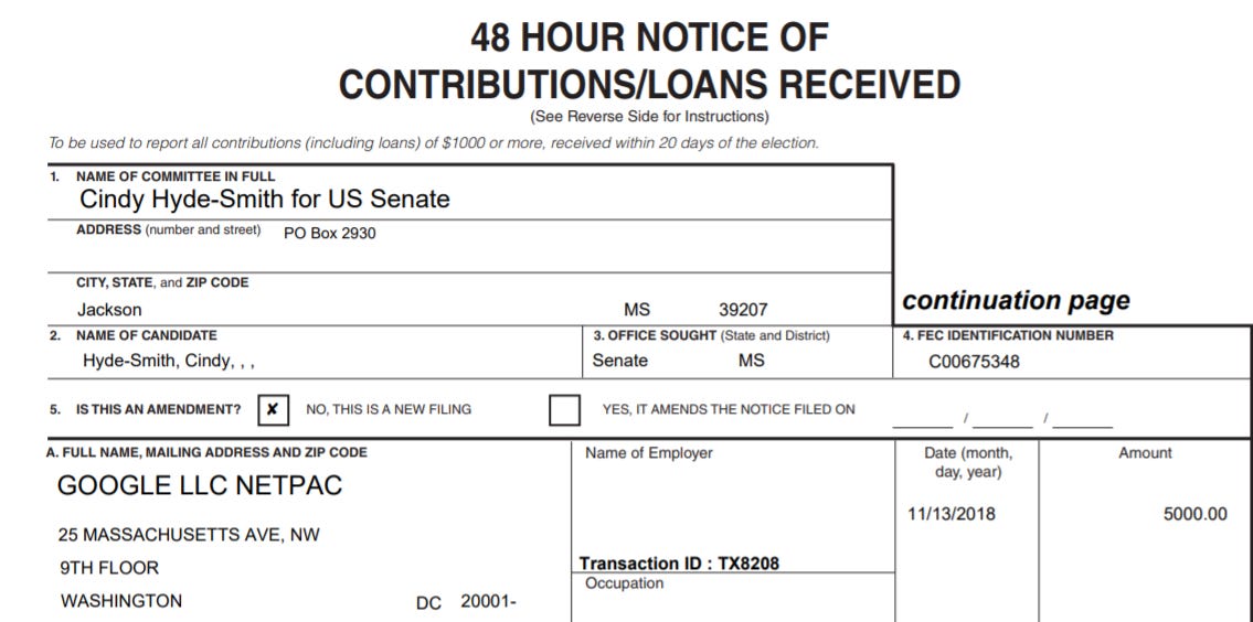 Google’s statement conflicts with the filing that the Hyde-Smith campaign made yesterday with the FEC, which lists November 13 as the date of the contribution. Federal regulations requires candidates, within 20 days of an election, to report contribution of $1000 or more within 48 hours.
