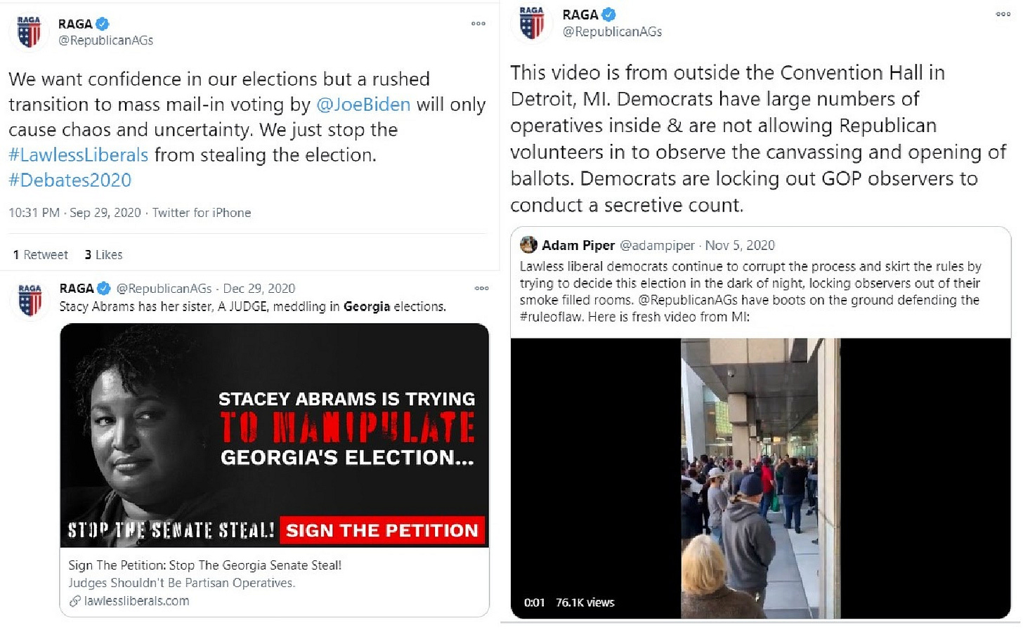 The Republican Attorneys General Association (RAGA) was involved in both activities. First, both the organization itself and the majority of its members pushed baseless allegations of voter fraud. Then, RAGA's self-described "policy arm," the Rule of Law Defense Fund (RLDF), sent a robo-call driving people to participate in the "March to Save America."