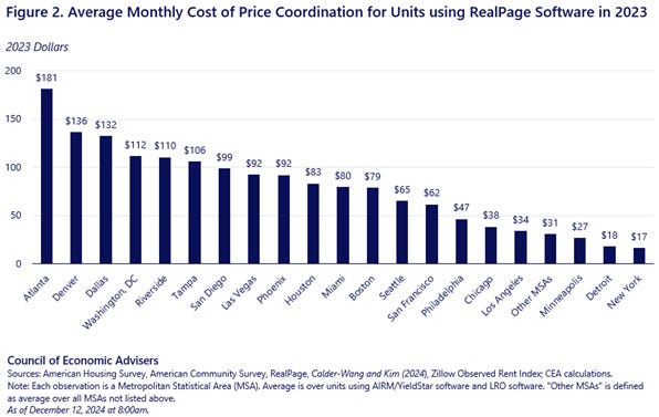 The CEA report is the first effort to quantify the difference between prices set by landlords using RealPage and prices in a truly competitive market. Looking at data from 2023, the CEA found that "algorithmic pricing cost renters in algorithm-utilizing units $70 a month, or 4% of rent, on average nationally." In six metro areas — Atlanta, Denver, Dallas, DC, Riverside, and Tampa — the price increase attributable to RealPage exceeds $100 a month.