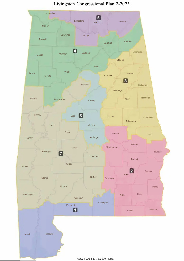 Alabama is on a path to approve new maps before Friday's deadline. But the new maps do not comply with the district court order and continue to dilute the Black vote. Specifically, the legislature has failed "to craft a second majority-Black district" or "something quite close to it." Instead, the new map only still includes one district, District 7, which is majority Black. It looks like this: