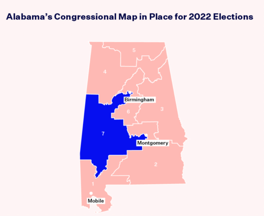 Alabama's map for the 2022 election, which is based on the 2020 Census, looks like this: