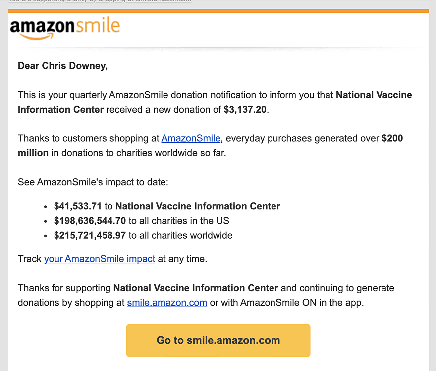 The amount sent from Amazon to NVIC has increased each of the last three quarters. Downey encourages VaxCalc users to enroll in the program. "Just a reminder that you can easily support NVIC with every Amazon purchase via https://smile.amazon.com/," Downey wrote in a post this January.