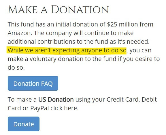 Amazon donated $25 million to the fund and is soliciting individual donations to add to the pot. It initially included an option to donate by text.