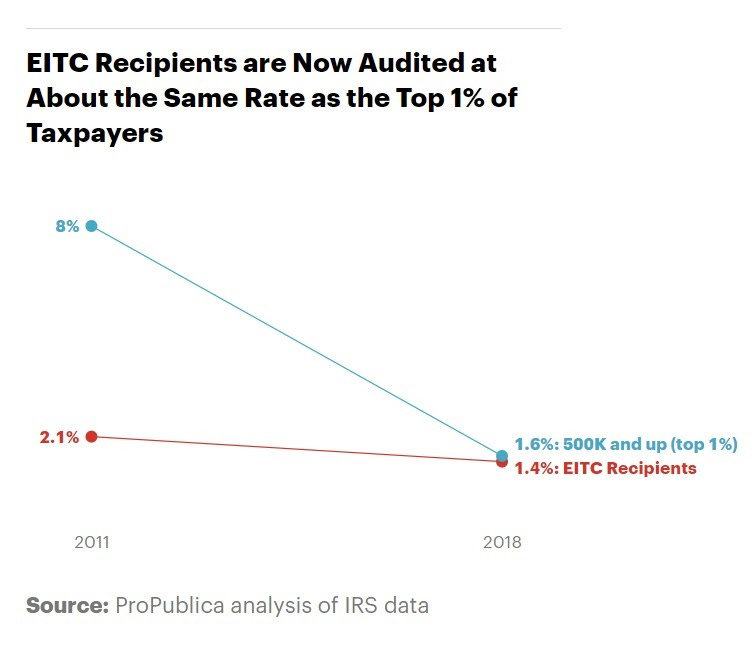 As resources for enforcement shrunk, the IRS began focusing a larger proportion of its efforts on auditing the poorest filers. In 2017, about 36% of all audits were targeted at the working poor. In 2018, filers who received the Earned Income Tax Credit (EITC), which is mostly available to Americans earning less than $20,000 annually, were audited at 1.41% rate — roughly the same as the audit rate for millionaires (1.56%).