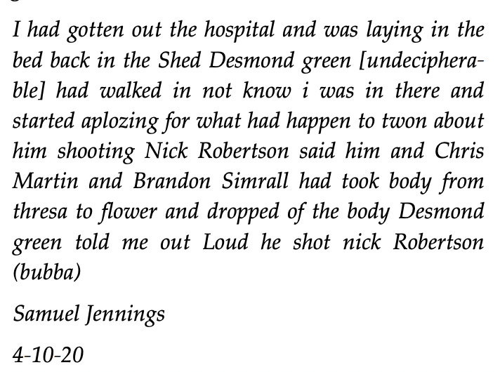 Two months later, in an unrelated incident, Samuel Jennings was arrested for burglary and grand larceny. Jackson Police Department Detective Jacquelyn Thomas visited Jennings at the detention center. Jennings provided Thomas with a rambling written statement pinning the blame for Robertson's murder on a man named Desmond Green. The statement also claimed that Green moved Robertson's body after the murder: