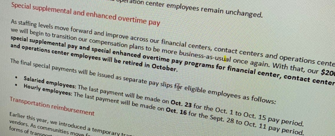 Yet, in a memo to employees obtained by Popular Information, Bank of America announced that it would end its pandemic pay increase. The memo informs employees that the company will "transition our compensation plans to be more business-as-usual once again." That means the company's "$200 special supplemental pay and special enhanced overtime pay programs… will be retired in October."