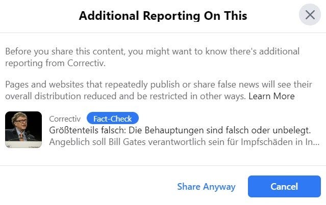 Despite these dangerously false claims, the article has generated 3.7 million views on Facebook. Nearly a month later, the article was fact-checked by Correctiv, a Facebook fact-checking partner in Germany. So if you try to share the post today, Facebook generates the following message.