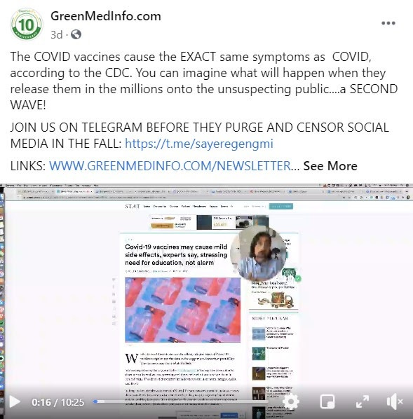 GreenMedInfo is a health disinformation website that has been banned from other social networks, including Pinterest. Mailchimp also has reportedly refused to allow the service to be used to send GreenMedInfo's newsletter. But it is allowed to operate on Facebook, where it has generated 39 million views over the last year. A recent video claims that the "COVID vaccines cause the EXACT same symptoms as COVID, according to the CDC." This is obviously not true, since no COVID vaccines have been approved in the United States.