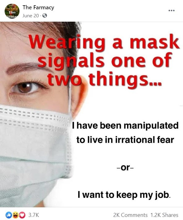 RealFarmacy is a website that "shares conspiracy theories and false claims regarding the COVID-19 pandemic." It also operates three large Facebook pages that collectively have 3.5 million followers. The pages feature memes like this, which mock efforts to control the spread of coronavirus with scientifically-proven methods.