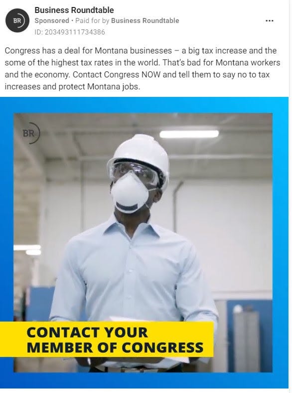 Last week, the Business Roundtable began running paid ads on Facebook opposing the reconciliation package. One ad called the legislation, which contains the Clean Energy Standard, "bad for Montana workers and the economy."