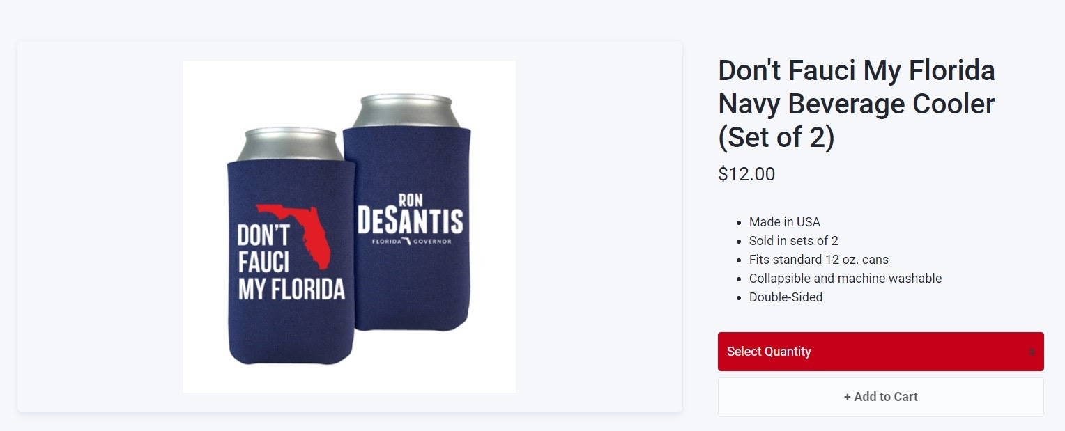 In the months that followed, DeSantis has taken an even more aggressive approach, openly mocking the advice of public health experts. In July, DeSantis' political committee began selling beer koozies and t-shirts with the slogan, "Don't Fauci My Florida."