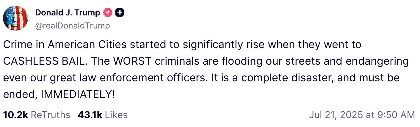 In a Monday post on Truth Social, Trump claimed that "CASHLESS BAIL" was a complete disaster. He said cities that implemented these policies saw crime "significantly rise," with "[t]he WORST criminals… flooding our streets."