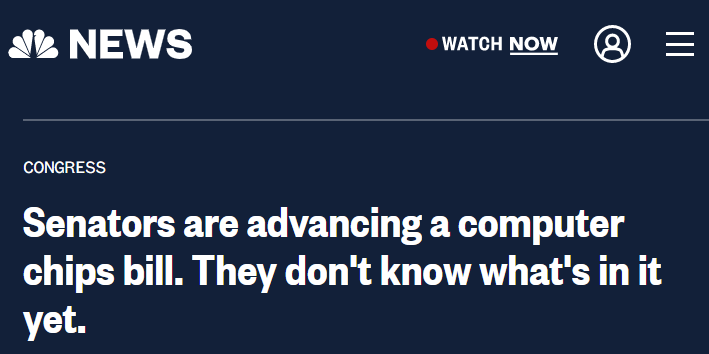 So how is Congress paying for $76 billion in subsidies to the computer chip industry? It's not. "Asked about the cost of the bill and whether it needed to be offset by cuts elsewhere… McConnell said he viewed the spending as important to national security," the Wall Street Journal reported.