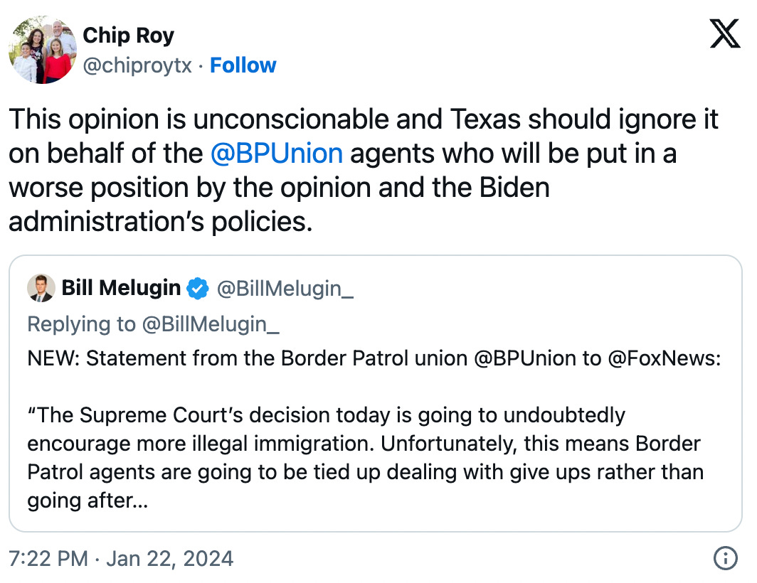 Congressman Chip Roy (R-TX) is publicly urging Texas to ignore the Supreme Court. In previously unreported comments, Roy explained that he feared his position would push the country into "a post-constitutional world." But, Roy said, the Supreme Court is "pushing our hand" by issuing a ruling related to the southern border that he opposes, and the Supreme Court needs to "feel the pressure."