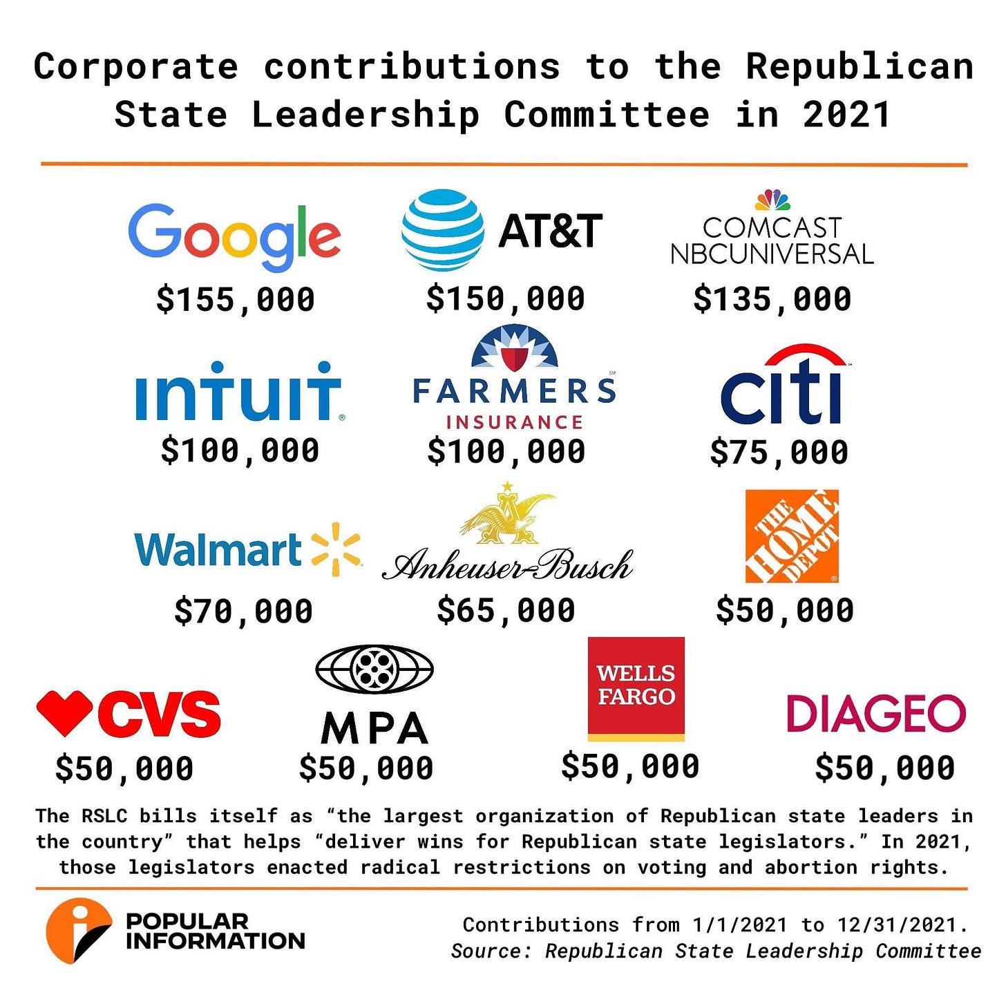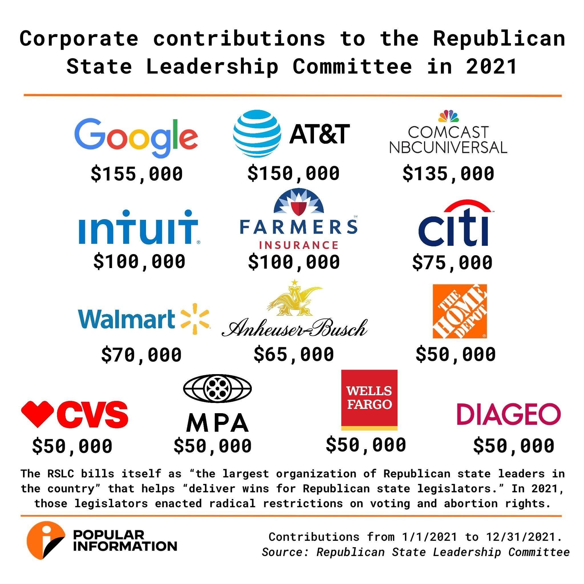 Other prominent corporate donors to the RSLC include Anheuser-Busch ($65,000), Diageo North America ($50,000), Farmers Insurance ($100,000), Home Depot ($50,000), Intuit ($100,000), Motion Picture Association ($50,000), Walmart ($70,000), and Wells Fargo ($50,000). Motion Picture Association declined to comment. The other companies did not respond to Popular Information’s requests for comment.