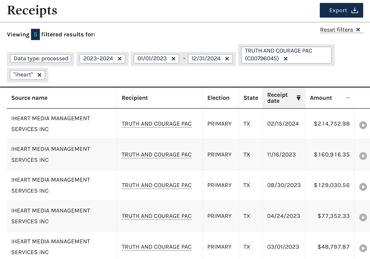 In a statement, the Cruz campaign said that Cruz hosts the podcast "for free," describing it as a volunteer position. But there appears to be quite a bit more to the relationship. Over the course of the last year, iHeart has paid $630,850 to the Truth and Courage PAC, a Super PAC devoted "to ensuring that Ted Cruz is re-elected to the United States Senate in 2024."