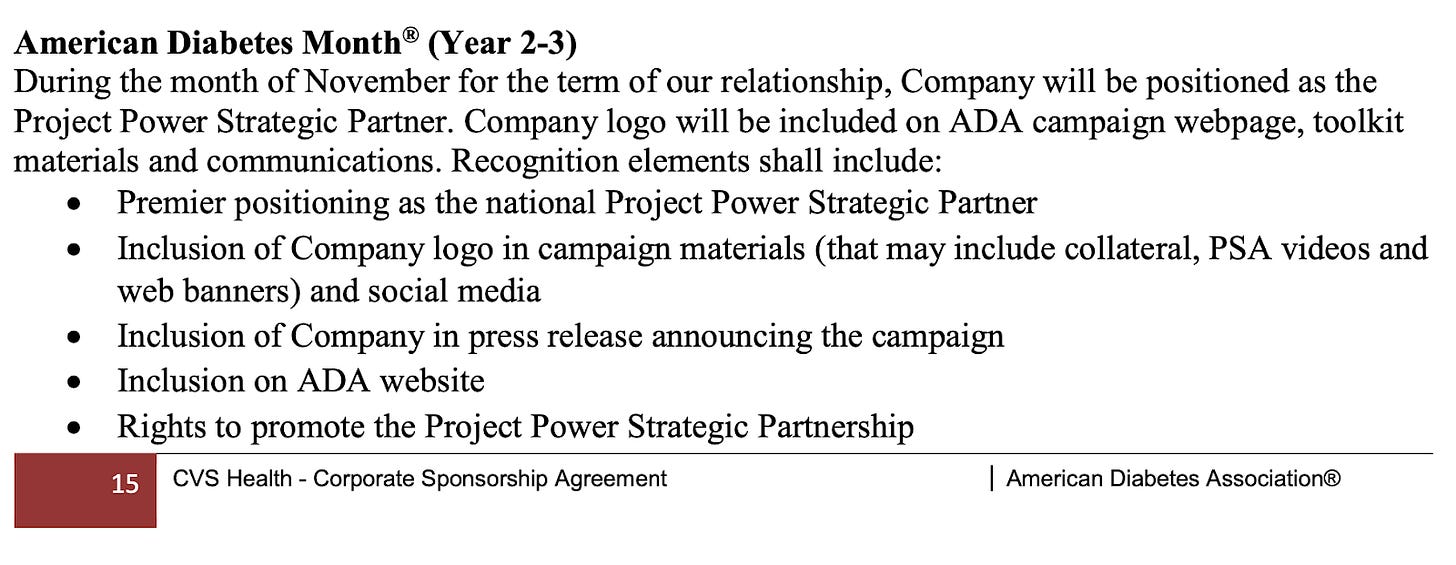 The agreement contains numerous pages laying out in detail how the ADA should recognize CVS. For example, the ADA must produce an "integrated marketing campaign… for 4 weeks each year recognizing Company’s support." During American Diabetes Month, CVS "will be included on [the] ADA campaign webpage, toolkit materials and communications."
