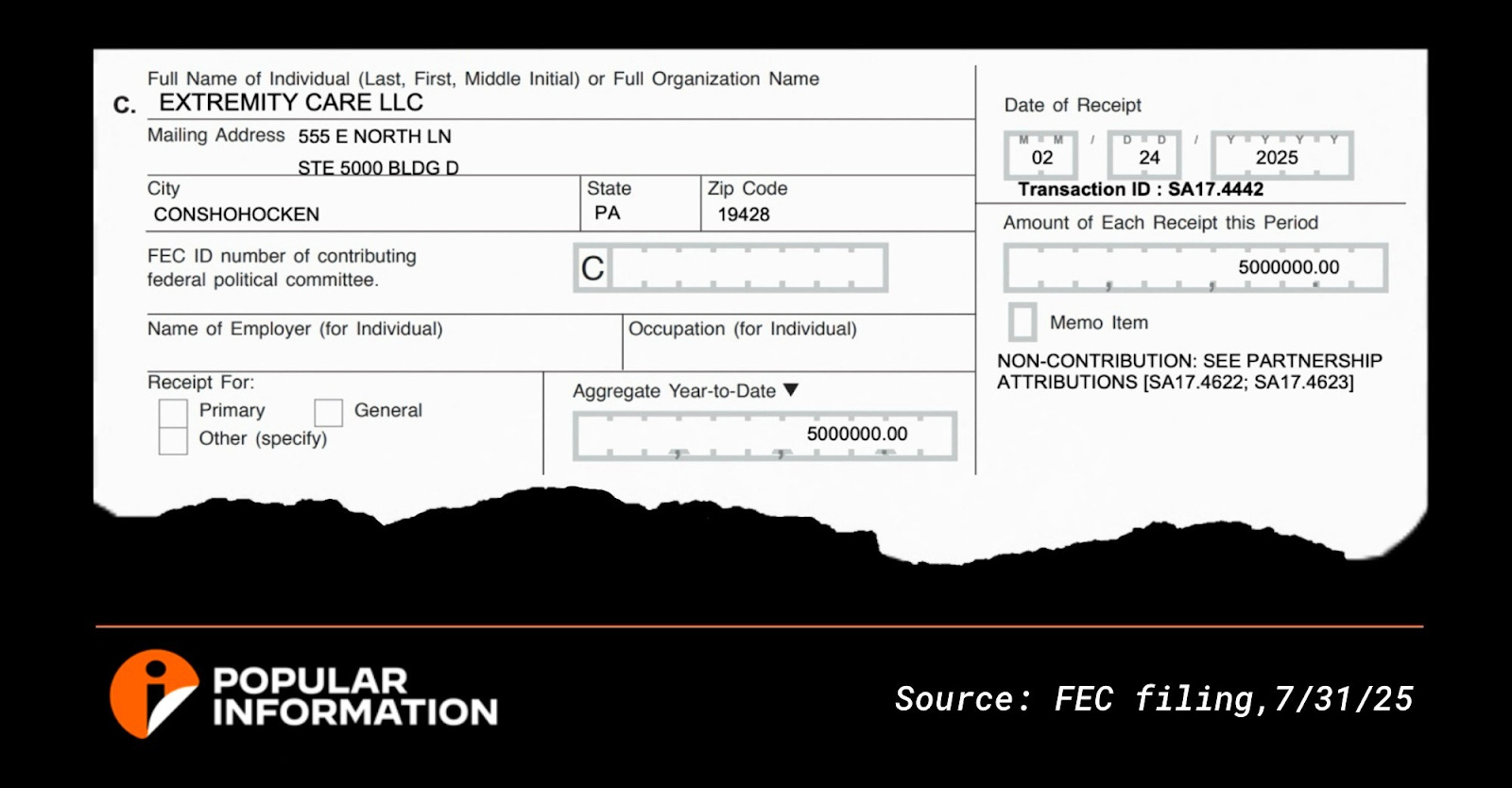 On February 24, 2025, Extremity Care LLC, a company that sells very expensive bandages made from discarded placentas and other substances, donated $5 million to MAGA Inc., President Trump's Super PAC. Six days later, on Truth Social, Trump blasted a pending Biden administration rule that would have barred Medicare from covering Extremity Care’s products — which can cost thousands of dollars per square inch and lack scientifically proven benefits. "'Crooked Joe' rammed through a policy that would create more suffering and death for diabetic patients on Medicare," Trump posted. "The hardest hit: veterans and minorities."