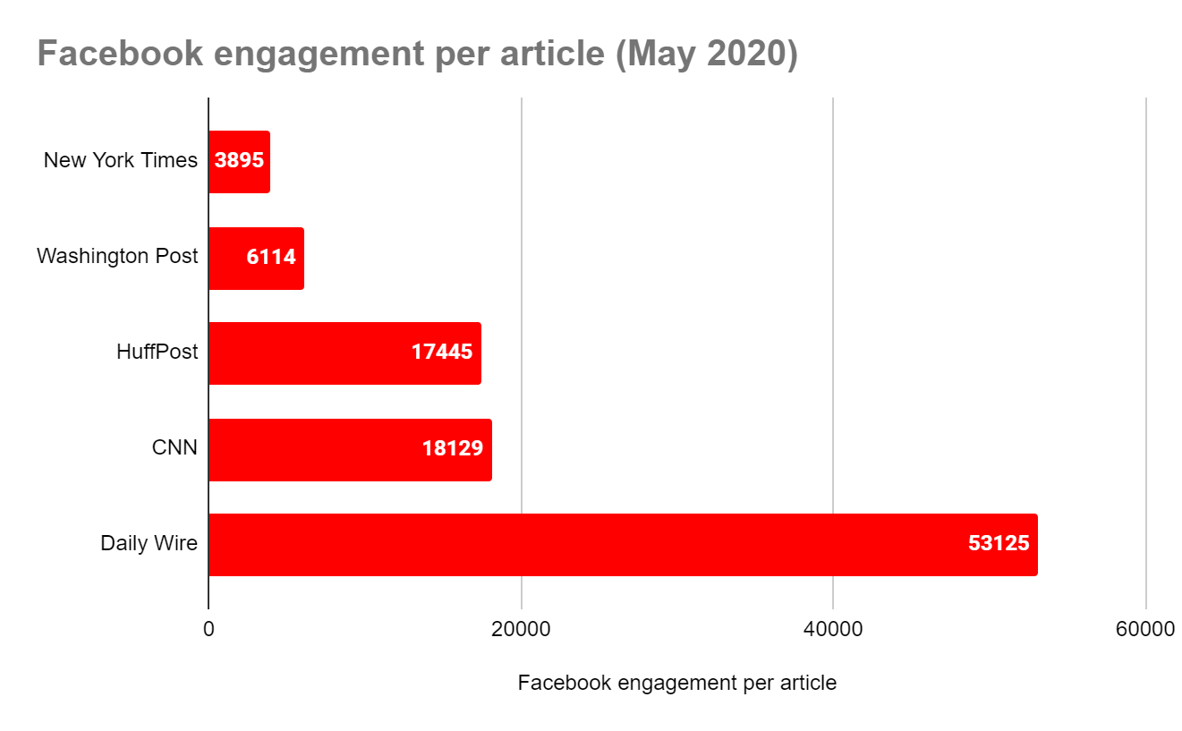 Popular Information has documented how social media platforms, particularly Facebook, caters to the right wing. A May 2020 analysis found that The Daily Wire, a right-wing outlet founded by conservative commentator Ben Shapiro, vastly outperformed every mainstream media outlet on a per article basis.