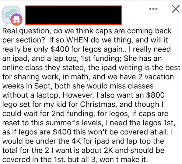 In another August 2023 message, a parent sorts through the logistics of using taxpayer funds to buy "an $800 lego set for my kid for Christmas."