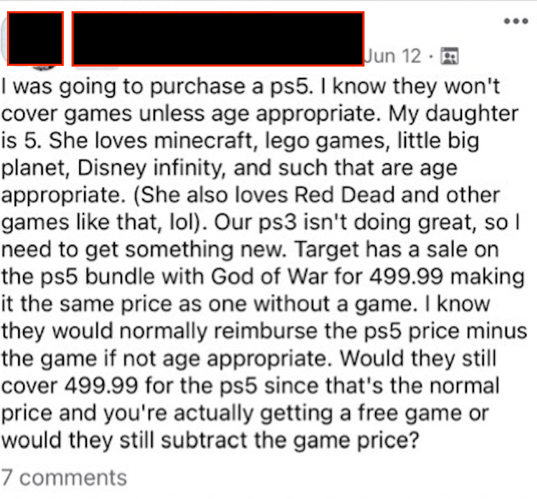 In a private Facebook message dated June 12, a parent says their PlayStation 3 "isn't doing great," and she needs "to get something new." She asks whether she will be reimbursed for a $500 PlayStation 5 bundle that includes "God of War," even though the game is "not age appropriate" for her 5-year-old daughter.