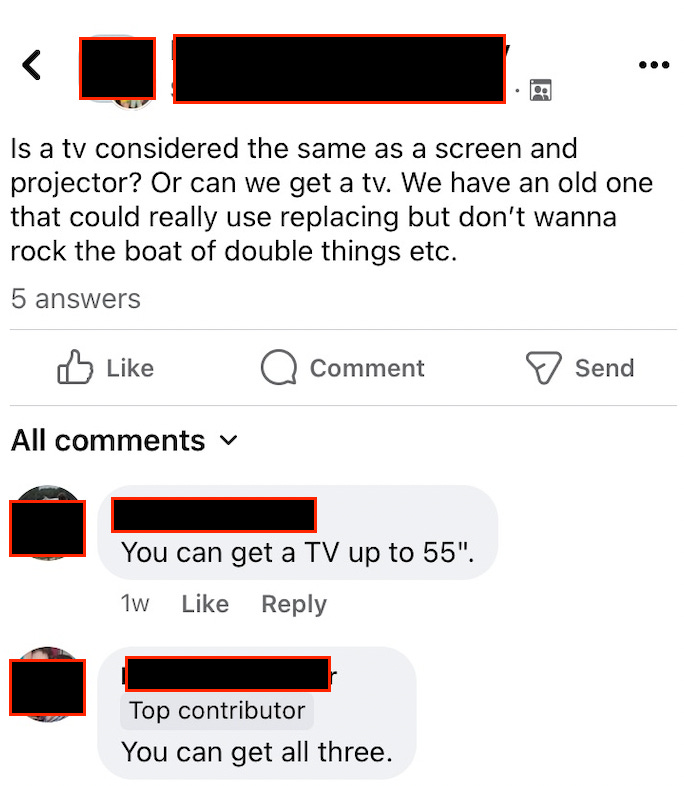 In another private Facebook message obtained by Popular Information, dated August 9, one parent laments that she has an "old" TV that "could really use replacing." She asks whether she could use voucher funds to replace the TV if she was also buying a "screen and projector." One group member tells her that she can buy a new 55-inch TV while another assures her she can buy "all three" — the new TV, a screen, and a projector — with voucher funds.