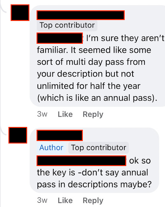 The members of the group then discuss how to characterize unlimited annual and semi-annual passes in order to secure approval.