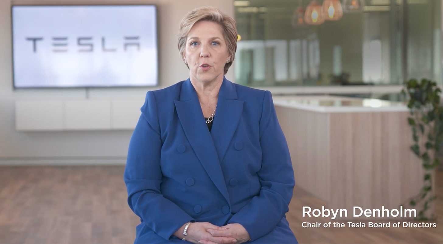 Denholm does not mention that she and other board members were sued in Delaware for awarding themselves excessive compensation and agreed to a settlement where they "collectively agreed to return more than $735 million to the electric car maker's coffers in combined options, cash and stocks." Denholm and the other board members did not admit to any wrongdoing.
