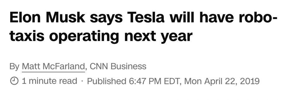 Increasingly, Musk is staking the company's future on his plan to make Tesla's fully autonomous. The "Full Self Driving" product currently "requires drivers to pay attention at all times and doesn’t make cars autonomous." Musk first claimed that Teslas would be fully self-driving in 2016. Since then, he's repeatedly announced that his vision was just around the corner but failed to deliver. In 2019, for example, he said that Tesla robotaxis would begin operating in 2020.
