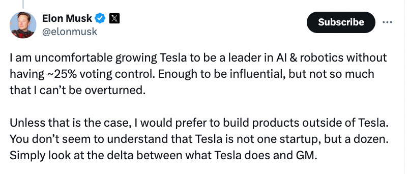 And Musk has already made clear that restoring his $50 billion pay package isn't enough to keep him interested in Tesla. Musk said he is "uncomfortable growing Tesla to be a leader in AI & robotics without having ~25% voting control."