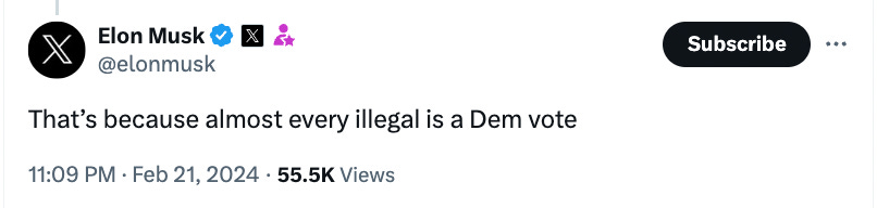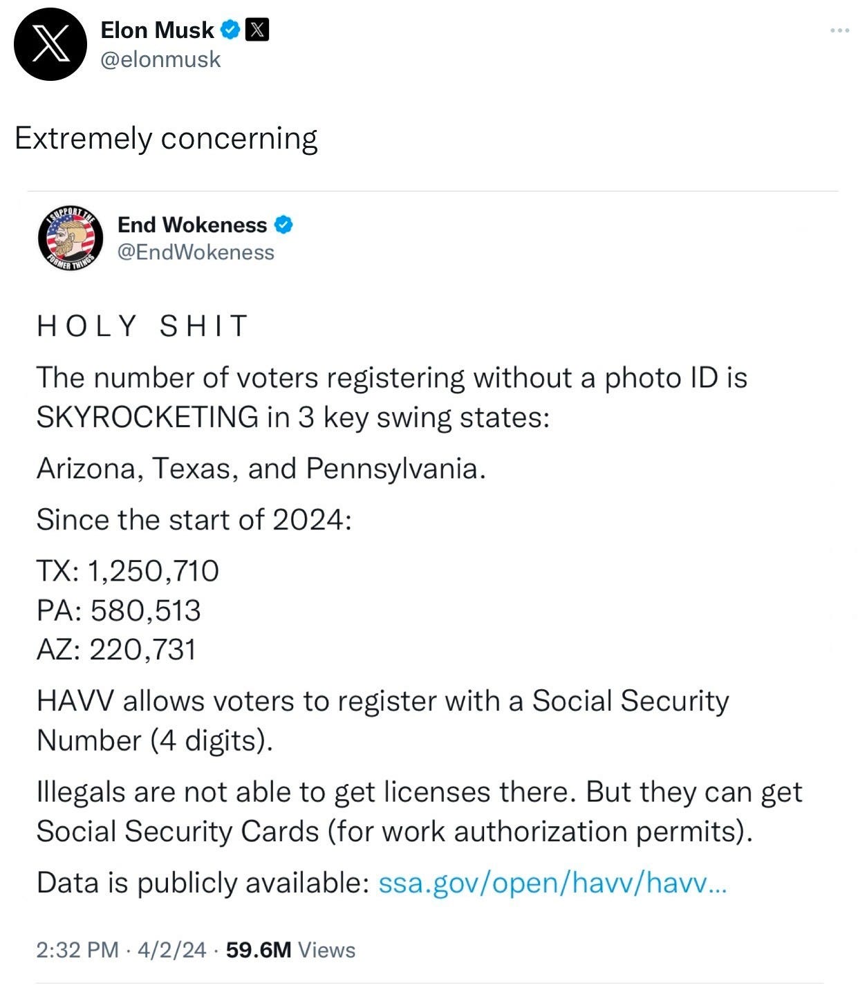 Musk promoted a post from @EndWokeness, a popular account that promotes bigoted conspiracy theories, that claimed to have uncovered "data" showing that hundreds of thousands of "illegals" have registered to vote since the start of 2024. Musk shared @EndWokeness' post with his 170 million followers and called it "extremely concerning."