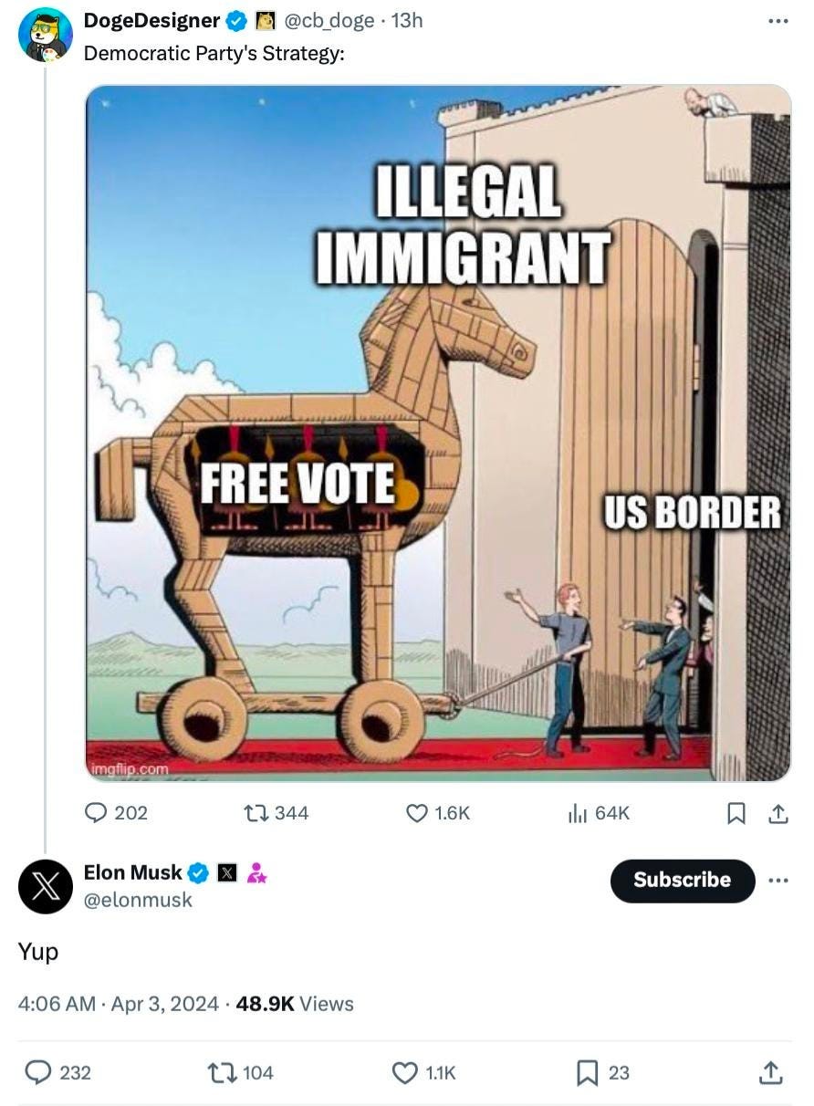 Musk is now using his dominant presence on the social network, which he has renamed X, to convince people that the 2024 presidential election is rigged. His efforts dovetail with the lies of Donald Trump, who recently claimed that Democrats are "allowing" undocumented immigrants to enter the country and "signing them up to vote."