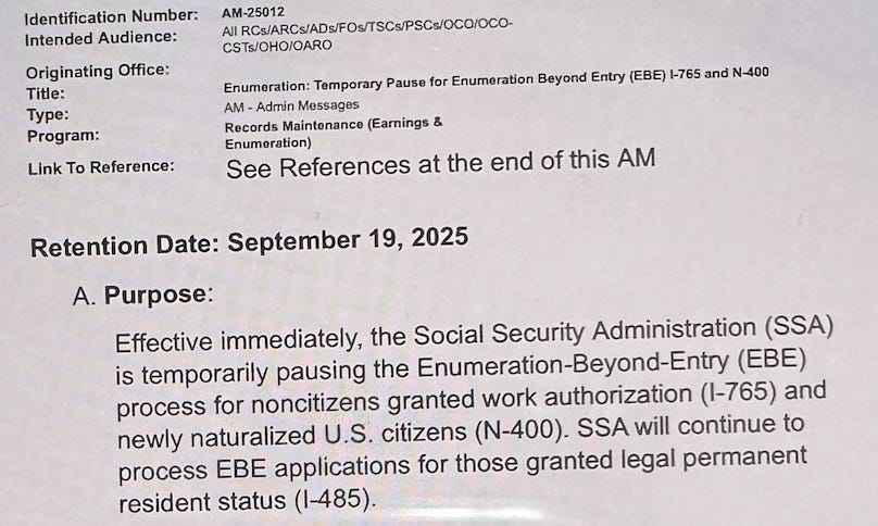 The SSA message, sent March 19, states that the EBE program for "noncitizens granted work authorization" and "newly naturalized U.S. citizens" has been "temporarily" frozen. It is unknown how long the freeze will be in place or if it will ever be lifted.