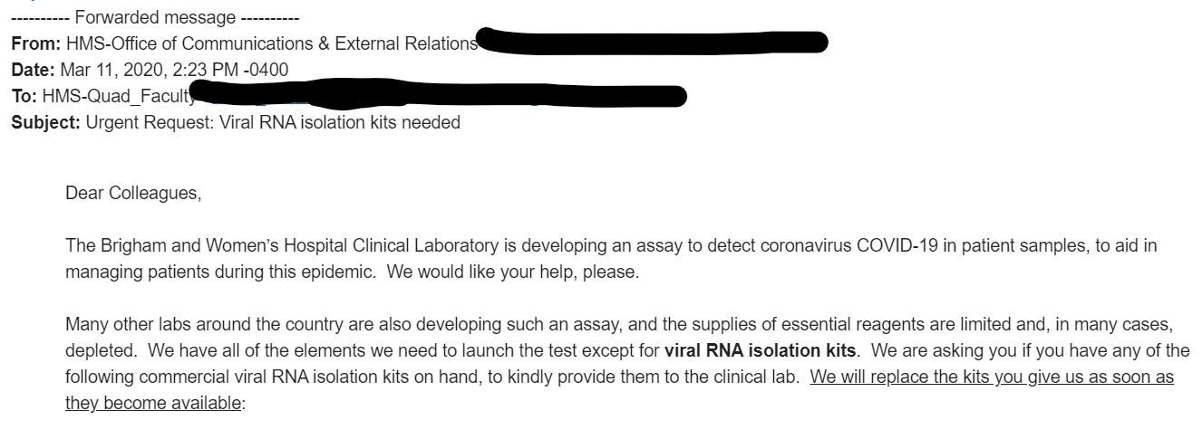 The Brigham & Women’s Hospital, a Boston-area facility, wants to start offering coronavirus tests, but can't obtain the RNA extraction kits. An email sent to all Harvard Medical School faculty, obtained by Popular Information, requests that the faculty send any kits they have on hand for research to the hospital for use in testing.