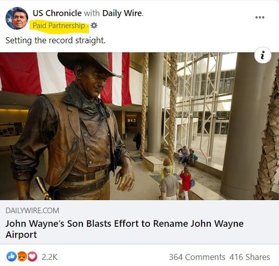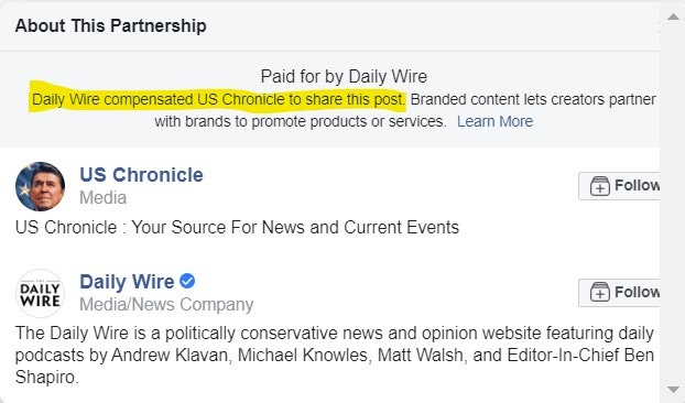 If you click the small "i" displayed over the photograph, it displays more information about the "partnership." Specifically, it says that "Daily Wire compensated US Chronicle to share this post."