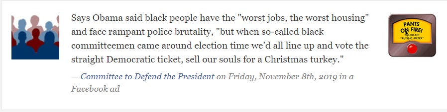 "The pro-Trump ad uses the passage to create the impression that Obama believed that black voters, ignored and suffering, sold their soul to the Democrats at election time. But the actual book passage is about the good things that come from voting," PolitiFact wrote.