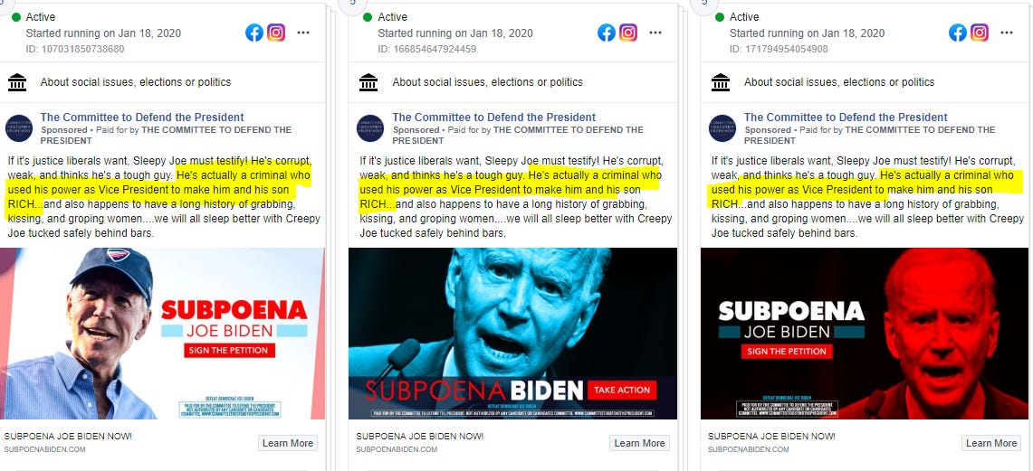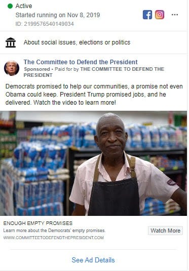 In October, the Committee to Defend the President ran ads falsely claiming "accused former Vice President Joseph R. Biden Jr. of blackmailing Ukrainian officials to stop an investigation of his son." The Biden campaign wrote a letter to Facebook objecting to the ad. Katie Harbath, a former Republican operative who now is Facebook's head of global campaigns, responded that the issue was moot since the ad was inactive by the time that the Biden campaign noticed it.